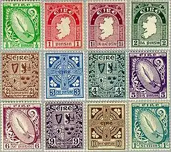 Les douze premiers timbres courants étaient de faible valeur faciale (de 1/2 ancien penny à 1 shilling) et furent émis entre décembre 1922 et 1923. Les timbres de haute valeur (2, 5 et 10 shilling) n'apparurent que le . Ils figuraient cinq représentations hautement symboliques du pays : « Épée de Lumière » (Sword of Light), « Carte d'Irlande » (Map of Ireland), « Croix celtique » (Celtic Cross), « Armes des Quatre Provinces » (Arms of the Four Provinces) et « Saint Patrick[18] ». Ces timbres n'ont été remplacés qu'en 1968 par une nouvelle série utilisant des motifs issus des arts anciens irlandais, série connue des philatélistes sous le nom de Gerl definitives. Ce fut la première redéfinition en trente-et-un ans pour les timbres de haute valeur et quarante-six ans pour ceux de faible valeur. Trois séries Gerl ont été émises, successivement en ancien système sterling, en système décimal et finalement en série sans filigrane[19].