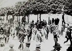 Défilé de compagnie d'archers pour l'ouverture du concours de tir à l'arc des JO 1900.Entrée du stand de tir à l'arc et à l'arbalette à Vincennes.Le stand de tir à l'arc de l'ancien vélodrome de Vincennes.
