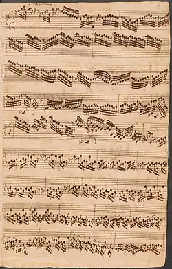 Elle est signée par un départ musclé et très rapide en triple-croche de la part de l'auteur. Dès le début, on trouve des silences pesants, mais rapidement, les triples-croches s'enchaînent sur 7 portées. Au départ on retrouve une ascendance de la mélodie, mais rapidement on passe dans une mélodie descendante (à partir de la portée 4) de 3 octaves pour ensuite remonter à partir de la portée 6 jusqu'à son arrêt momentané par un do bref et puissant de la part de la pédale. De nouveau, après un court silence, les triples-croches permettent de jouer une certaine lourdeur musicale sur 9 notes en tout, 3 par 3, pour finir par un do bref aussi. Enfin Bach nous montre la descendance de la mélodie par des triples-croches rapides et longs (1 octave) avec encore une fois la tonique jouée à la pédale permettant ainsi de finir les triples-croches d'une façon anarchique et désarticulée, mais calculée de la part de Bach finissant sur un do.