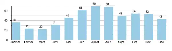 Précipitations mensuelles moyennes relevées à Tomsk (en millimètres)