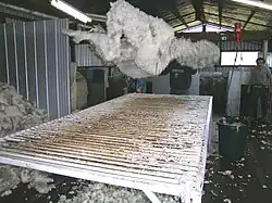 La toison peut être ensuite passée au rouleau à laine pour éliminer les gouttes de transpiration et triée pour éliminer les parties moins souhaitables. On appelle parties à dėborder toutes celles qui doivent être ôtées de la toison proprement dite. Ce sont d’une part les bords de la toison qui font l'objet d'une attention particulière car les mèches y sont souvent souillées, mais aussi la laine du ventre, de l’écusson, des casquettes. Les dėbords c’est-à-dire des morceaux de laines non adhérents à la toison, les secondes coupes, etc. Mais aussi des parties de la toison retirées parce que contenant de la laine souillée, feutrée, avec trace de peinture. qui ont encore une utilité dans l'industrie. En tant que tels ces débordés ont encore une valeur, ils sont placés dans des conteneurs séparés pour être vendus. Les autres objets retirés de la toison sur la table, tels que les matières fécales, les fragments de peau, les brindilles et les feuilles, sont jetés dans un contenant proche de la table de tri afin de ne pas contaminer la toison[10].