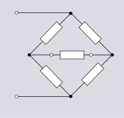 Il est normal de qualifier un réseau de topologie de pont uniquement si on l'utilise comme un réseau à deux ports où les ports d'entrée et de sortie sont chacun constitués d'une paire de nœuds diagonalement opposés. On peut considérer la topologie de boîte de la figure 1.7 identique à la topologie de pont, mais dans le cas du filtre, les ports d'entrée et de sortie seront chacun une paire de nœuds adjacents. On inclut parfois dans la topologie de pont la composante de chargement (ou d'indication nulle) sur le port de sortie du pont, tel qu'illustré à la figure 1.9[7].
