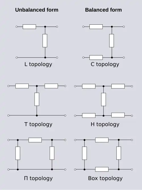 Les topologies dans la figure 1.7 sont communément utilisées dans la conception de filtres et d'atténuateurs. La topologie en L est identique à celle du diviseur de potentiel. La topologie en T est identique à celle en Y. La topologie en Π est identique à celle en Δ.