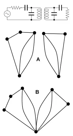 Dans la représentation graphique classique des circuits, il n'existe aucun moyen de représenter explicitement les couplages inductifs mutuels, comme cela se produit dans un transformateur. De tels composantes peuvent entraîner un graphe déconnecté avec plus d'une partie distincte. Pour faciliter l'analyse, un graphe à plusieurs parties peut être combiné en un seul graphe. Pour ce faire, on unifie un nœud de chaque partie en un seul nœud.Le comportement théorique du circuit ne s'en trouve pas modifié, de sorte que l'analyse effectuée sur celui-ci est toujours valide. Cependant, en pratique, si un tel circuit devait être mis en œuvre, le comportement changerait, car le circuit détruirait l'isolement entre les pièces. Un exemple serait un transformateur mis à la terre des côtés primaire et secondaire. Le transformateur fonctionnerait toujours comme un transformateur avec le même rapport de tension, mais ne pourrait plus être utilisé comme transformateur d'isolement[45].