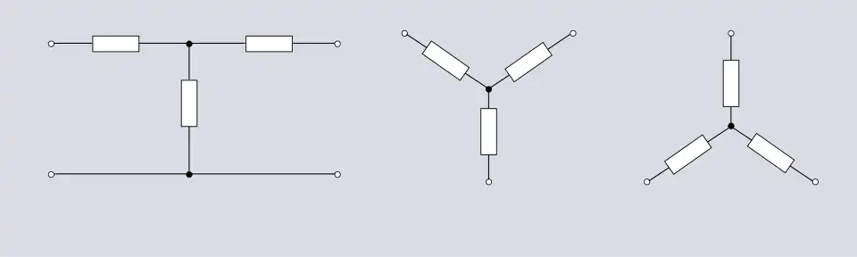Un exemple d'un tel réseau est illustré à la figure 1.6, où on a un réseau Y connecté en parallèle avec un réseau Δ. Supposons que l'on veuille calculer l'impédance entre deux nœuds du réseau. Souvent, cela peut se faire par applications successives des règles de combinaison des impédances série ou parallèle. C'est toutefois impossible dans ce réseau, car il faut utiliser la transformée Y-Δ en plus des règles en série et parallèle[4]. La topologie Y se nomme également topologie en étoile. Cependant, la topologie en étoile peut aussi référer au cas plus général de n mailles connectées au même nœud plutôt que trois[5].