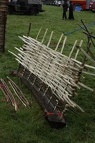 Les clayonnages étaient faits de bois souples et pas trop putrescibles (noisetiers ou châtaigniers fendus par exemple, et assemblés en forme de claies sur le modèle d’une vannerie simple. Des lianes de clématite, assouplies par trempage ou cuisson, étaient utilisées pour la finition entre le haut des murs et la toiture[2].