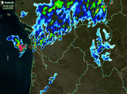 À 13 h 45, les images radars laissaient apparaître une cellule orageuse sur le Golfe de Gascogne, en direction des côtes charentaises. Assez actif, cet orage s'organisait rapidement en système linéaire à propagation rétrograde.