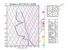 Le sondage supra indique les conditions atmosphériques à Bordeaux à 14 h juste avant le passage du front froid[6].