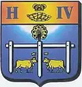 La description des armoiries de Pau est la suivante : d’azur à la barrière de trois pals aux pieds fichés d’argent, sommée d’un paon rouant d’or accompagnée en pointe et intérieurement de deux vaches affrontées et couronne royale fermée d’azur rehaussé d’or, accompagnée à dextre de la H capitale et senestre du chiffre IV romain aussi d’azur.