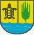 Armoiries de la ville de Grünheide, seconde municipalité allemande, est une commune du Land de l’Oder-Spree située au sud-est de Berlin dans la région du Brandebourg. Son blason se compose sur fond sinople où émerge de trois vagues azur et trois vagues sinople, une tortue orangée en pal. Malgré nos multiples recherches, on n’a pu découvrir aucune explication sur l’origine de ces armoiries. Cette agglomération compte quatre villages dont deux ont des blasons avec tortue.