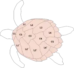 En français, elle est dite « imbriquée » et en latin « imbricata » parce que les plaques arrière de sa dossière se chevauchent.