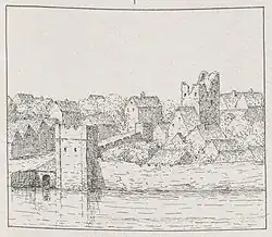 L'ensemble tour Hugon dont la grande tour (en arrière-plan) très endommagée, appuyé sur l'enceinte gallo-romaine, au XIIe siècle (restitution de C. Vischer et H. Piccart)