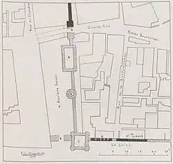 La Tour Hugon (A), la tour carrée (C) dans le coin nord-est du castrum gallo-romain et la chapelle Saint-Libert, d'après un plan du XVIIIe siècle (selon de Clérambault).