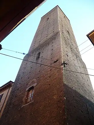 Érigée dans la seconde moitié du XIIe siècle, elle mesure 61 mètres de haut, ce qui en fait la deuxième tour la plus haute de Bologne après la tour des Asinelli. Par le passé, elle était d'ailleurs probablement encore plus élevée, comme en témoignent à la fois l'épaisseur considérable des murs à la base (environ 2,28 mètres), et la présence d'une fenêtre coupée du toit actuel.