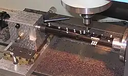 - des vis (3) maintenant les clefs en bout d'axe, également vissées sur des tourillons. Il s'agit de « clefs à tringle » dont l'axe est plein et percée à chaque extrémité pour recevoir les pointes de vis[4]. Cette solution offre une grande réduction des frottements donc une plus grande vélocité à l'instrument. Elle est surtout moins encombrante, mais ne permet pas l'alignement de plusieurs clés. Seulement là aussi, pour les pièces de grande longueur la maîtrise du jeu mécanique est délicate.