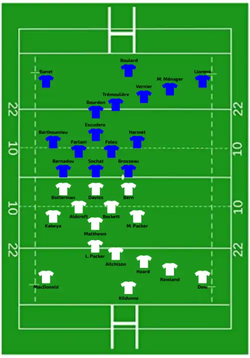 - 8 essais de Beckett (1re), Heard (15e), Kildunne (20e), M.Packer (25e), Talling (35e), Reed (70e) et Matthews (77e, 80e+2).