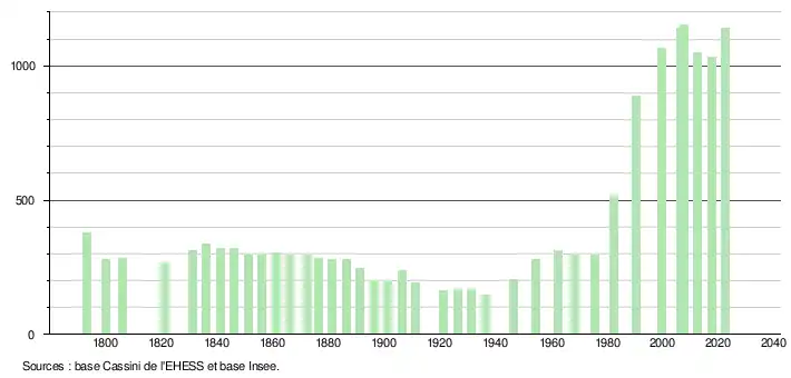 L'évolution du nombre d'habitants est connue à travers les recensements de la population effectués dans la commune depuis 1793. Pour les communes de moins de 10 000 habitants, une enquête de recensement portant sur toute la population est réalisée tous les cinq ans, les populations de référence des années intermédiaires étant quant à elles estimées par interpolation ou extrapolation[28]. Pour la commune, le premier recensement exhaustif entrant dans le cadre du nouveau dispositif a été réalisé en 2007[29].