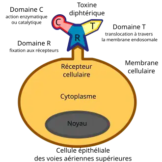 Le domaine R (aussi appelé sous- unité B) est situé à la partie C-terminale de la toxine diphtérique tandis que le domaine C (généralement appelé sous- unité A) est situé vers la partie N-terminale. La raison pour laquelle il y a deux appellations différentes pour les domaines est que la découverte de cette toxine est significativement ultérieure (environ 120 ans plus tôt) à la compréhension du mécanisme d’action de la toxine. Il est en effet plus simple d’expliquer le fonctionnement de la toxine à l’aide de trois domaines actifs contrairement à deux.