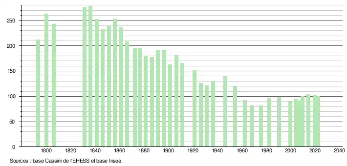 L'évolution du nombre d'habitants est connue à travers les recensements de la population effectués dans la commune depuis 1793. Pour les communes de moins de 10 000 habitants, une enquête de recensement portant sur toute la population est réalisée tous les cinq ans, les populations de référence des années intermédiaires étant quant à elles estimées par interpolation ou extrapolation[17]. Pour la commune, le premier recensement exhaustif entrant dans le cadre du nouveau dispositif a été réalisé en 2004[18].