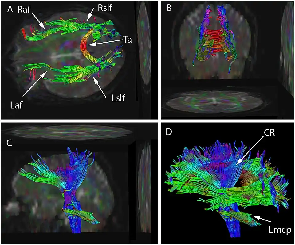 - (en) Cet article est partiellement ou en totalité issu de l’article de Wikipédia en anglais intitulé « Tractography » (voir la liste des auteurs).