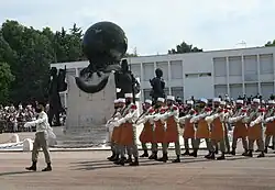 Le « pas légion »[4] est cadencé à 88 par minute (120 pas par minute pour le régime général et 140 pas par minute pour les chasseurs alpins et chasseurs à pied). Cette cadence est héritée du rythme de déplacement des armées de l'Ancien Régime et de l'Empire, dont le régiment d'Hohenlohe[4], duquel la Légion étrangère a conservé nombre de traditions.