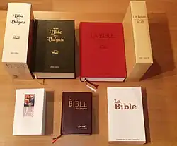- 2001, La Bible[15], appelée aussi La Bible, nouvelle traduction (parfois abrégé BNT), Bible Bayard (de Bayard Presse) ou Bible des écrivains[16], Bible des poètes.