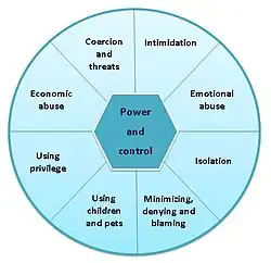 Les trafiquants sexuels exercent différents méthodes pour s'assurer un contrôle sur leurs victimes, comme les menaces, les agressions physiques et sexuelles, la confiscation de documents légaux nécessaires au voyage et à l'immigration, ainsi que des menaces contre la famille des victimes[90]. L'université du Minnesota à Duluth a publié une « roue du pouvoir et du contrôle » afin de mieux cibler les interventions relatives aux abus familiaux[91]. Cette roue identifie huit mécanismes principaux pour dominer les victimes, comme l'intimidation, la violence psychologique, l'isolement, le refus, les culpabilisation, la minimisation, les agressions sexuelles, les agressions physiques, l'abus de position d'autorité, l'exploitation économique, la coercition et les menaces. Le développement de cette roue est motivé par la volonté de conseiller et d'informer les groupes de soutien aux victimes de trafic sexuel. Elle décompose les stratagèmes utilisés contre les victimes afin que le cycle de la violence soit exprimé de façon visuelle, puis enrayé.