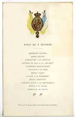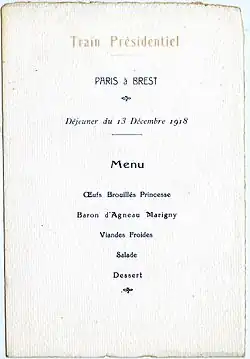 Les voyages officiels et trains spéciaux de toutes natures ont donné lieu à de très nombreux banquets servis à bord. Ces voyages sont accompagnés par six chefs de brigades : MM. Lagarde (de 1887 à 1890) ; Rousta (de 1890 à 1912) ; Bouvier (de 1912 à 1929) ; Jarlan (de 1929 à 1941) ; Schneider (de 1941 à 1958) et Goutte (de 1958 à nos jours)[4]. Charles Bouvier en particulier a réuni une collection de 1000 menus datant de 1887 à 1931, visible dans le restaurant d'application de l'école supérieure d'hôtellerie Luxury Hotelschool Paris[5].