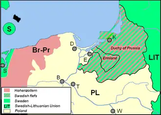 Mis en difficulté par de l'entrée en guerre de nombreux pays contre la Suède, Charles X Gustave signa en janvier 1656 avec Frédéric-Guillaume Ier le traité de Labiau, qui libéra la maison de Hohenzollern de la vassalité envers la Suède en échange de la perte de la Warmie et d'une participation plus active à la guerre. Dans les traités ultérieurs de Wehlau et de Bromberg, Jean II Casimir confirma la souveraineté de Frédéric-Guillaume Ier en Prusse après que ce dernier a abandonné la Suède dans la guerre[12].