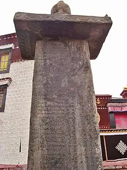 En 823, on érigea devant la porte principale du Temple de Jokhang à Lhassa une stèle connue sous le nom de « Tablette de pierre de l’Unité du long Terme » et dont il existerait deux autres exemplaires, l'un dans la capitale de la Chine à Chang'an à la porte de l'empereur, et l'autre à la frontière tibéto-chinoise sur le Mont Meru[5]. Y sont inscrits les termes du traité d'alliance.