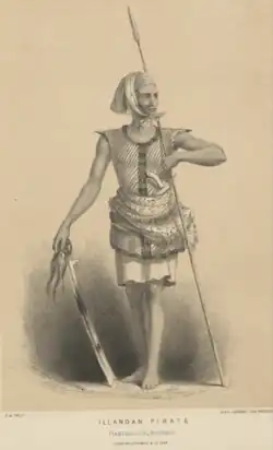 Un pirate Iranun armé d'une lance, d'une épée kampilan et d'un poignard kriss.
