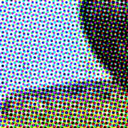 En couleurs, on utilise une trame de points pour chaque couleur primaire, cyan, magenta et jaune, plus le noir, effectuant une synthèse soustractive des couleurs limitées au gamut permis par les trois couleurs primaires.