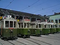 Plusieurs générations de tramways regroupés en 2004 au dépôt d'Eigerplatz.