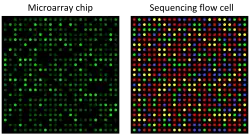 Les premières étapes de l'ARN-seq comprennent également un traitement d'image similaire ; toutefois, la conversion des images en données de séquence est généralement gérée automatiquement par le logiciel de l'instrument. La méthode de séquençage par synthèse d'Illumina produit un réseau de grappes réparties sur la surface d'une Flow Cell[98], qui est imagée jusqu'à quatre fois au cours de chaque cycle de séquençage, avec des dizaines ou des centaines de cycles au total. Les grappes de cellules de flux sont analogues aux taches des microréseaux et doivent être correctement identifiées au cours des premières étapes du processus de séquençage. Dans la méthode de pyroséquençage de Roche, l'intensité de la lumière émise détermine le nombre de nucléotides consécutifs dans une répétition homopolymère. Il existe de nombreuses variantes de ces méthodes, chacune ayant un profil d'erreur différent pour les données obtenues[99].