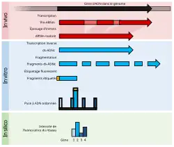 La génération de données sur les transcrits d'ARN peut être réalisée selon deux principes principaux : le séquençage de transcrits individuels (EST ou ARN-Seq) ou l'hybridation de transcrits à un réseau ordonné de sondes nucléotidiques (microarrays)[44].