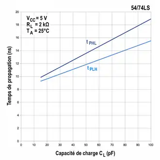 Les temps de transition du signal à la sortie d'une porte logique intervenant dans les délais de propagation, ces derniers augmentent lorsque la charge connectée à la sortie est plus importante :