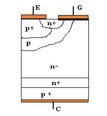 La structure d’un IGBT est basée sur celle d’un MOSFET vertical doublement diffusé[8] : l’épaisseur du support est utilisée pour séparer le drain de la source. Les épaisseurs typiques des wafers sont de l'ordre de 70 à 100 µm. Une zone dite d'épitaxie, dopée N-, permet l'apparition d'un canal lorsque des électrons sont injectés par la grille (VG>0, état passant).
