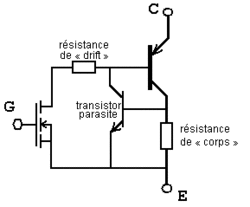 L’IGBT est un transistor hybride, regroupant un transistor à effet de champ du type MOSFET en entrée et un transistor bipolaire en sortie. Il est ainsi commandé par la tension de grille (entre grille et émetteur) qui lui est appliquée, mais ses caractéristiques de conduction (entre collecteur et émetteur) sont celles d’un bipolaire. Le schéma équivalent du transistor IGBT ci-contre montre un troisième transistor, qui représente une propriété parasite responsable du latching.