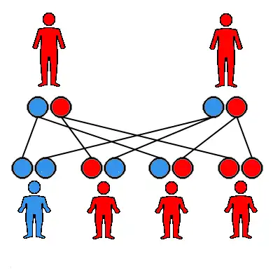 Dans les schémas les gamètes porteurs de l'allèle sain sont bleus, les gamètes porteurs de l'allèle muté sont rouges. Les personnes malades sont rouges, les personnes saines sont bleues.