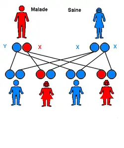 - toutes les filles seront malades, car leur père leur transmet obligatoirement le X, porteur de la maladie.