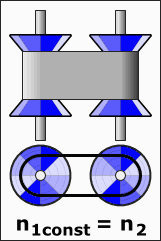 Il existe plusieurs variantes d'implémentation d'un variateur, dont une est assez régulièrement utilisée sur des véhicules terrestres motorisés : celle à poulies à entraxe fixe et courroie trapézoïdale. Le fonctionnement est le suivant : une courroie de section trapézoïdale est reliée à deux poulies constituée chacune de deux flasques coniques dont l'écartement fait varier le rapport de démultiplication entre la poulie menante et la poulie menée tout en maintenant la courroie en tension[8]. À l'arrêt, le système déconnecte la transmission finale de l'arbre moteur. Ce système dans une version automatisée est utilisé, sous l'appellation CVT, sur de nombreux scooters et certaines voitures de petite cylindrée[9]: l'écartement des flasques est déterminé par le régime moteur.