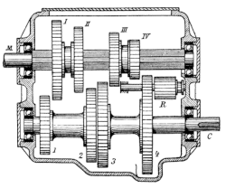- Engrenages : le pignon du vilebrequin est relié à un ensemble de pignons permettant d'une part d'atteindre les organes récepteurs du mouvement, et d'autre part de définir le sens et la vitesse de rotation en fonction du facteur de réduction obtenu par l'enchaînement de ces pignons ;