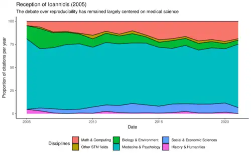 Au cours des années 2010, la crise de la reproductibilité a gagné bien d’autres disciplines. Le volume annuel des citations de l’article fondateur de John Ioannidis Why Most Published Research Findings Are False (Pourquoi la plupart des résultats de recherche scientifique publiés sont faux) dans les principaux domaines scientifiques selon les métadonnées enregistrées par le moteur de recherche académique Semantic Scholar (6 349 entrées en juin 2022) montre combien la démonstration s’est particulièrement étendue aux sciences informatiques. En économie, une réplication de 18 études expérimentales de deux grandes revues a révélé un taux d’échec comparable à ceux de la psychologie ou de la médecine (39 %).[39].