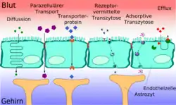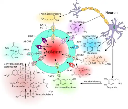 Dans la barrière hémato-encéphalique, on trouve des transporteurs actifs en influx pour l'enképhaline[31],[32], la vasopressine (hormone antidiurétique) (AVP)[33] et la D-pénicillinamine2,5-enképhaline (DPDPE)[34] – le produit du gène de résistance multiple aux drogues (gène MDR1) a été le premier transporteur d'efflux identifié à la barrière hémato-encéphalique[35]. Là-dessus sont venues plus tard les protéines reliées aux résistances multidrogues, par exemple, le gène MRP1[36], qui appartiennent aussi à la famille des transporteurs ABC. La protéine de résistance au cancer mammaire (BCRP)[37],[38] se trouve avec la glycoprotéine P en réalité sur la paroi luminale, dirigée vers le sang, de l'endothélium[37],[39],[40].