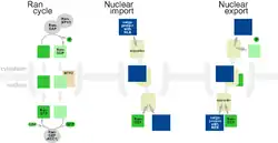 Le schéma classique de l'import des protéines-NLS est le suivant : l'importine-α se lie initialement à la séquence NLS et sert d'adaptateur à l'importine-β. Le complexe importineβ-importineα-protéine-NLS passe par translocation (à travers le pore nucléaire) dans le noyau grâce à une interaction "importine-pore" (ATP dépendante). Une fois à l'intérieur du noyau, l'importine-β est dissociée du complexe par une molécule de Ran-GTP. L'exportine CAS qui est liée à Ran-GTP dans le noyau, interagit alors avec l'importine-α et la dissocie de la protéine-NLS. Celle-ci est alors libérée dans le nucléoplasme. Les complexes importine-β-RanGTP et importine-α-CAS-RanGTP peuvent alors diffuser vers le cytoplasme. Dans le cytoplasme, les molécules de GTP sont hydrolysées en GDP ce qui aboutit au relargage des importines α et β qui sont alors disponibles pour un nouveau cycle d'import de protéine-NLS.
