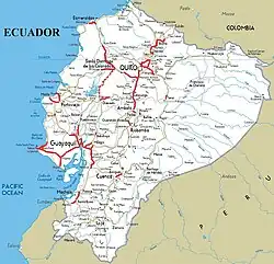 Autoroutes à 2 voies ou plus dans chaque sens, au Équateur en 2025, en rouge