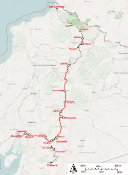 Historiquement, le premier moyen de transport moderne qui a parcouru l'Équateur a été le train, qui a relié Quito à Guayaquil via Riobamba et Alausí, inauguré en 1908. Cette ligne a été considérée comme la plus difficile du monde, de par la topographie andine et la descente abrupte vers la côte[1]. Un tronçon nord reliant Quito à Ibarra est inauguré en 1929[2], puis prolongé en 1957 jusqu'à San Lorenzo (Équateur) (en)[1]. La dernière ligne importante, celle atteignant Cuenca, est terminée en 1965 mais ne sera jamais desservie par un service fiable[3]. En 1994, la plupart de ces tronçons sont abandonnés car non rentables face à la concurrence de la route, seul étant maintenu le trajet entre Ibarra et San Lorenzo pour lequel il n'existait pas de solution routière[1]. Depuis l'achèvement de la route entre Ibarra et San Lorenzo, le chemin de fer en Équateur n'est plus exploité à des fins de transport de passager, mais certains tronçons sont maintenus à des fins touristiques, par exemple entre Ibarra et Lita ou entre Riobamba et la Nariz del Diablo, passage spectaculaire où la ligne la plus difficile du monde perd rapidement de l'altitude grâce à une descente en lacets.