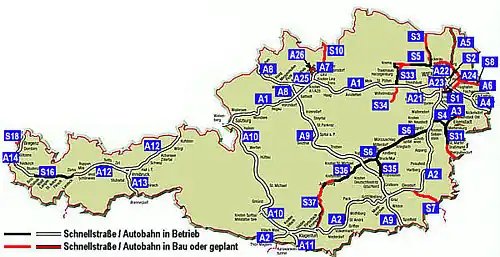 - A1 (E 60), « Westautobahn », axe Est-Ouest passant par Vienne, l'aéroport de Schwechat et accès vers les pays de l’Est