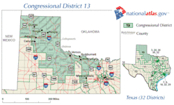 Le 13e district congressionnel du Texas est un district qui comprend la majeure partie du Texas Panhandle, des parties de Texoma et le nord-ouest du nord du Texas. Les principales villes du district sont Amarillo, Gainesville et Wichita Falls[1]. Il serpente à travers le Panhandle jusqu'aux plaines du sud, puis s'étend vers l'est à travers la vallée de la Red River. Couvrant plus de 40 000 miles carrés (100 000 km2), c'est le 19e plus grand district du pays en terme de superficie, le 14e qui ne couvre pas un État entier, ainsi que le deuxième plus grand du Texas derrière le 23e district. Une fois le recensement de 2020 terminé, le 13e district a été fortement redessiné pour incorporer Denton, une banlieue de plus en plus Démocrate du complexe métropolitain de Dallas-Fort Worth qui était auparavant le pilier du 26e district[2]. Avec un indice CPVI de R+26, c'est l'un des districts les plus républicains du Texas[3].