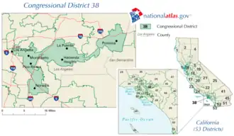 Les 38e, 34e et 42e sont divisés par Sne partie des villes de Downey et Pomona, une partie de la census-designated place d'Avocado Heights, les villes de Whittier, Montebello, Norwalk, Pico Rivera, Diamond Bar, La Mirada, Walnut, Santa Fe Springs, La Habra Heights et Industry tout comme les census-designated places d'Hacienda Heights, East Whittier, South Whittier, West Whittier-Los Nietos, Rose Hills et Rownland Heights.